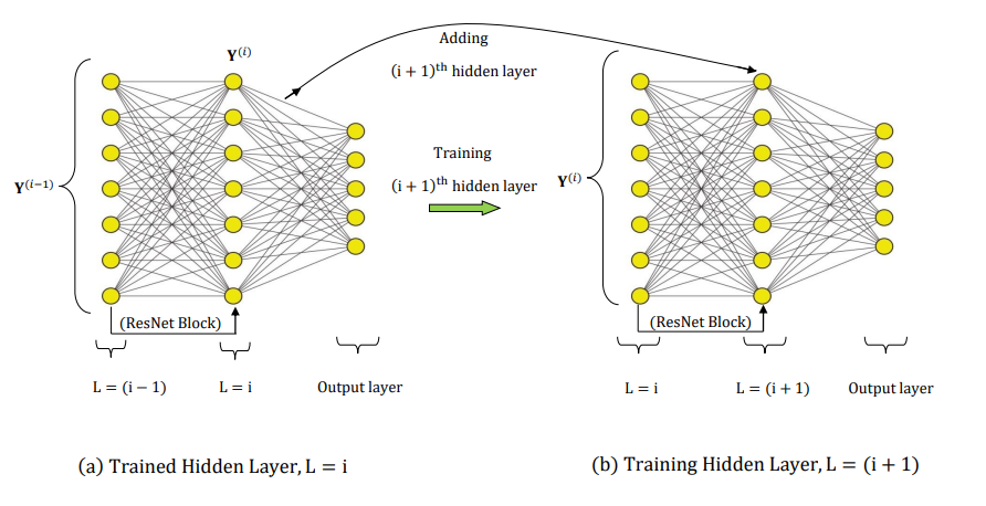 networks (Algorithm I). In this project, the layers of a resnet architecture is trained one at a time, and once they are trained, the input data is mapped forward through the layer to create a new learning problem. This is then